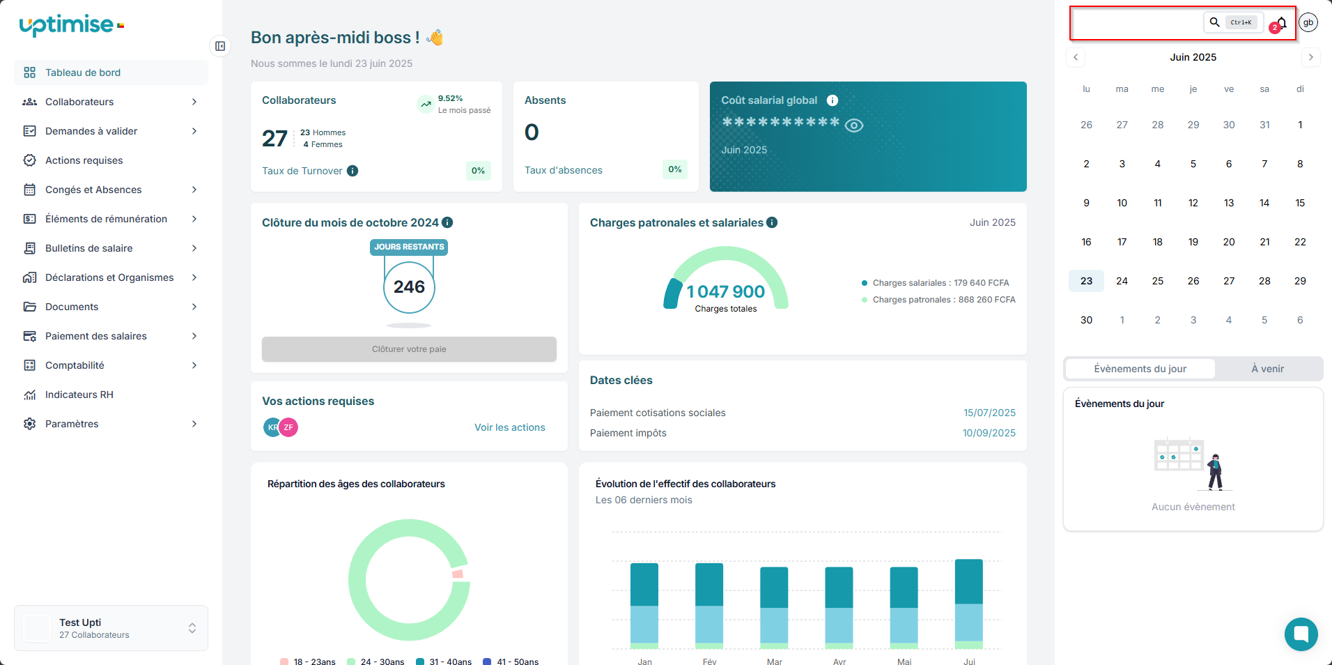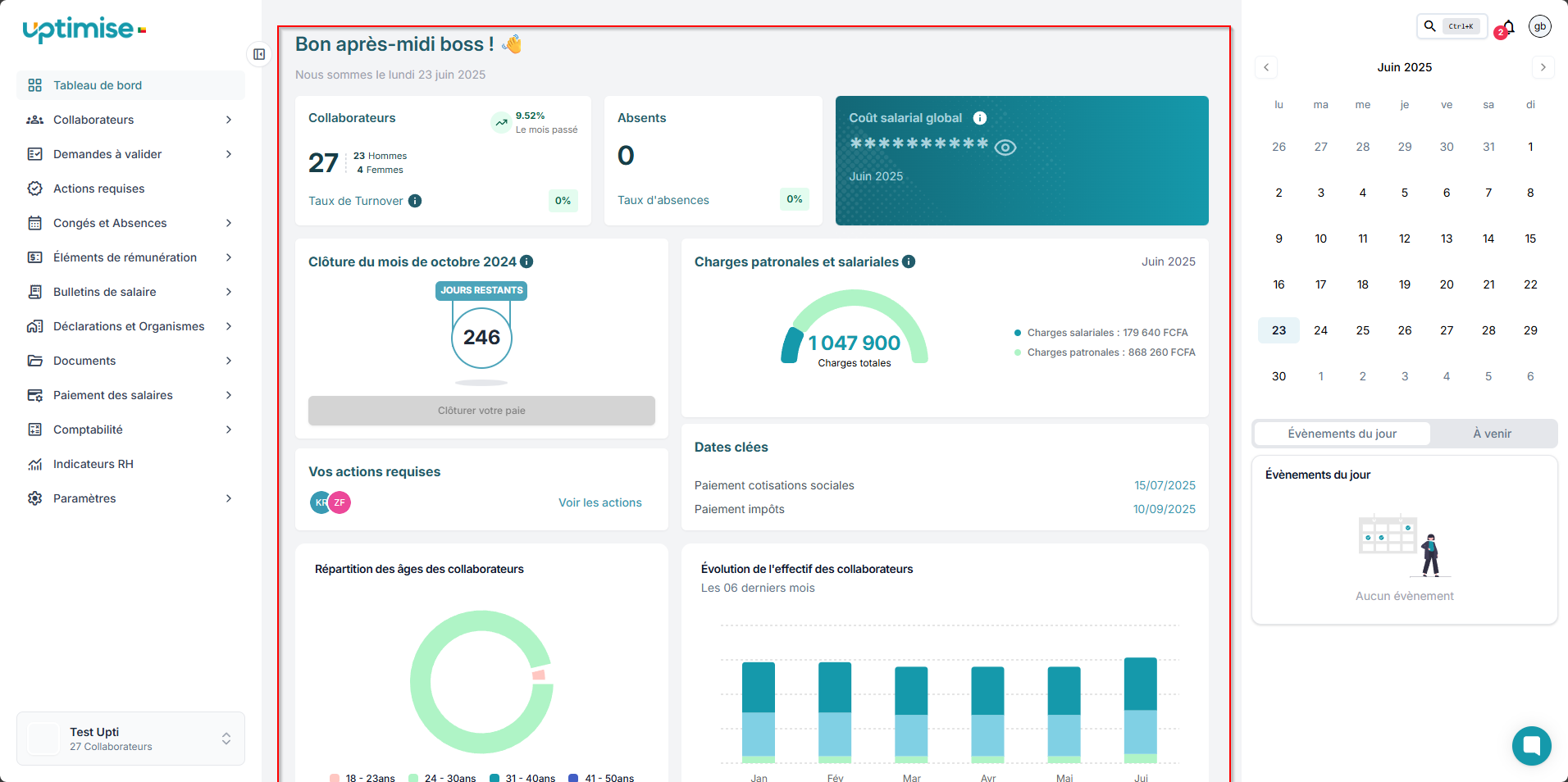 Votre Tableau de Bord : Le Quartier Général de Votre RH !Dès votre connexion, le tableau de bord vous offre une vue d'ensemble instantanée et complète de votre activité RH.