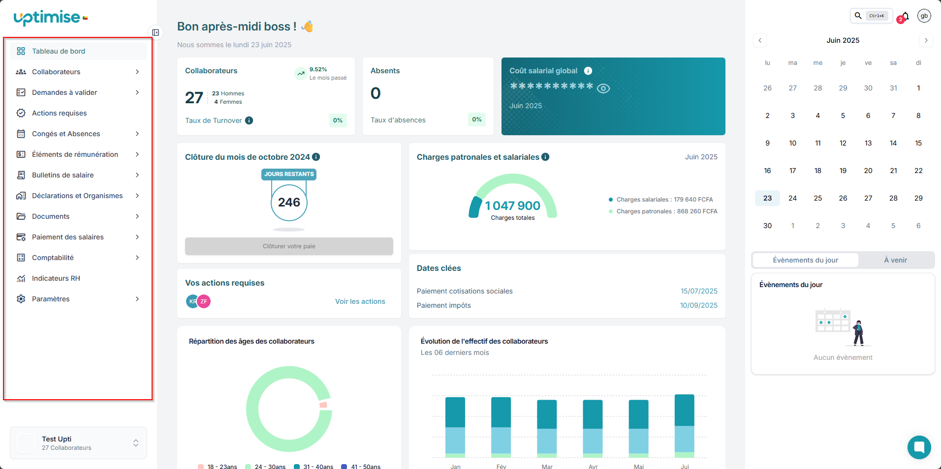 Avec cette nouvelle mise à jour, les anciens espaces "Entreprise" et "Collaborateurs" ont été unifiés en un seul menu latéral. Il regroupe désormais toutes les fonctionnalités pour une navigation simplifiée et rapide, vous offrant un contrôle total sur l'ensemble de vos opérations RH.