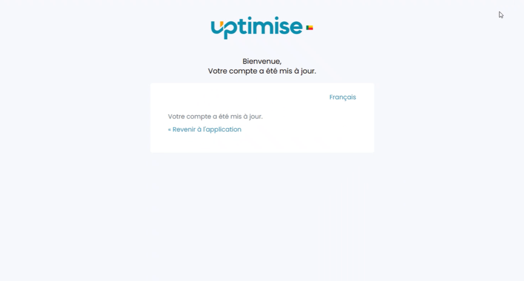 Étape 4 — Confirmation de la mise à jourAprès avoir créé votre mot de passe, Uptimise vous confirme que votre compte a bien été activé.