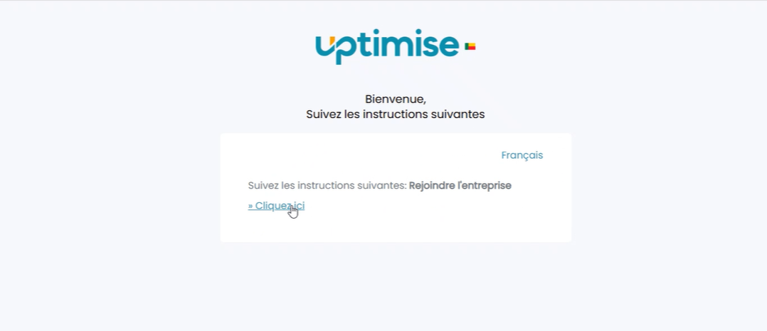 Étape 2 — Cliquer pour rejoindre l’entrepriseAprès avoir cliqué sur le lien, vous arrivez sur une page d’accueil Uptimise.
