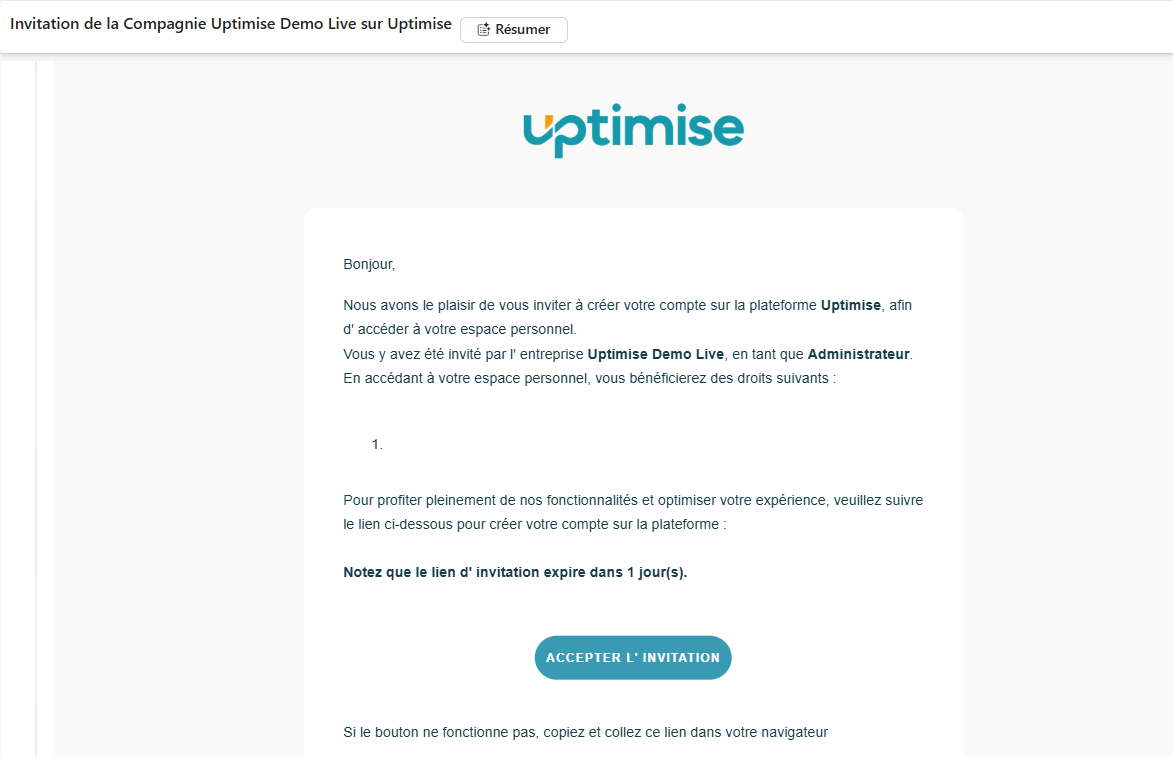 Cet email vous informe que votre entreprise vous donne accès à votre espace Uptimise.