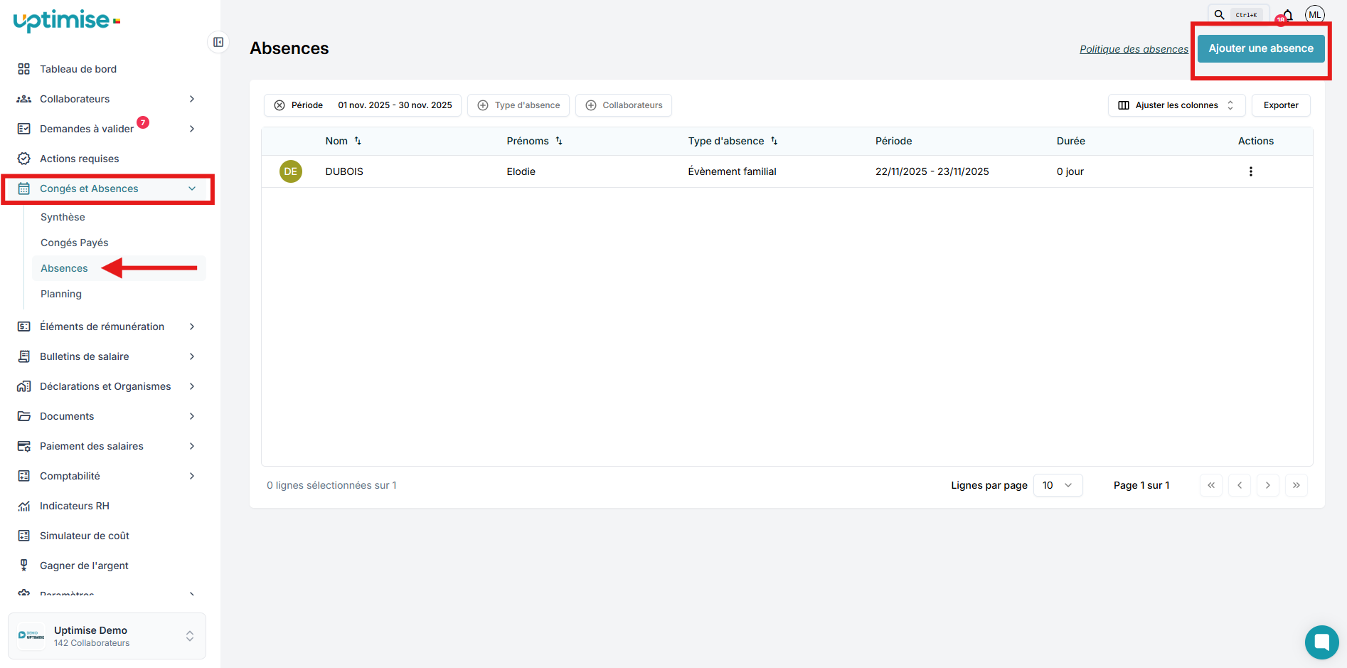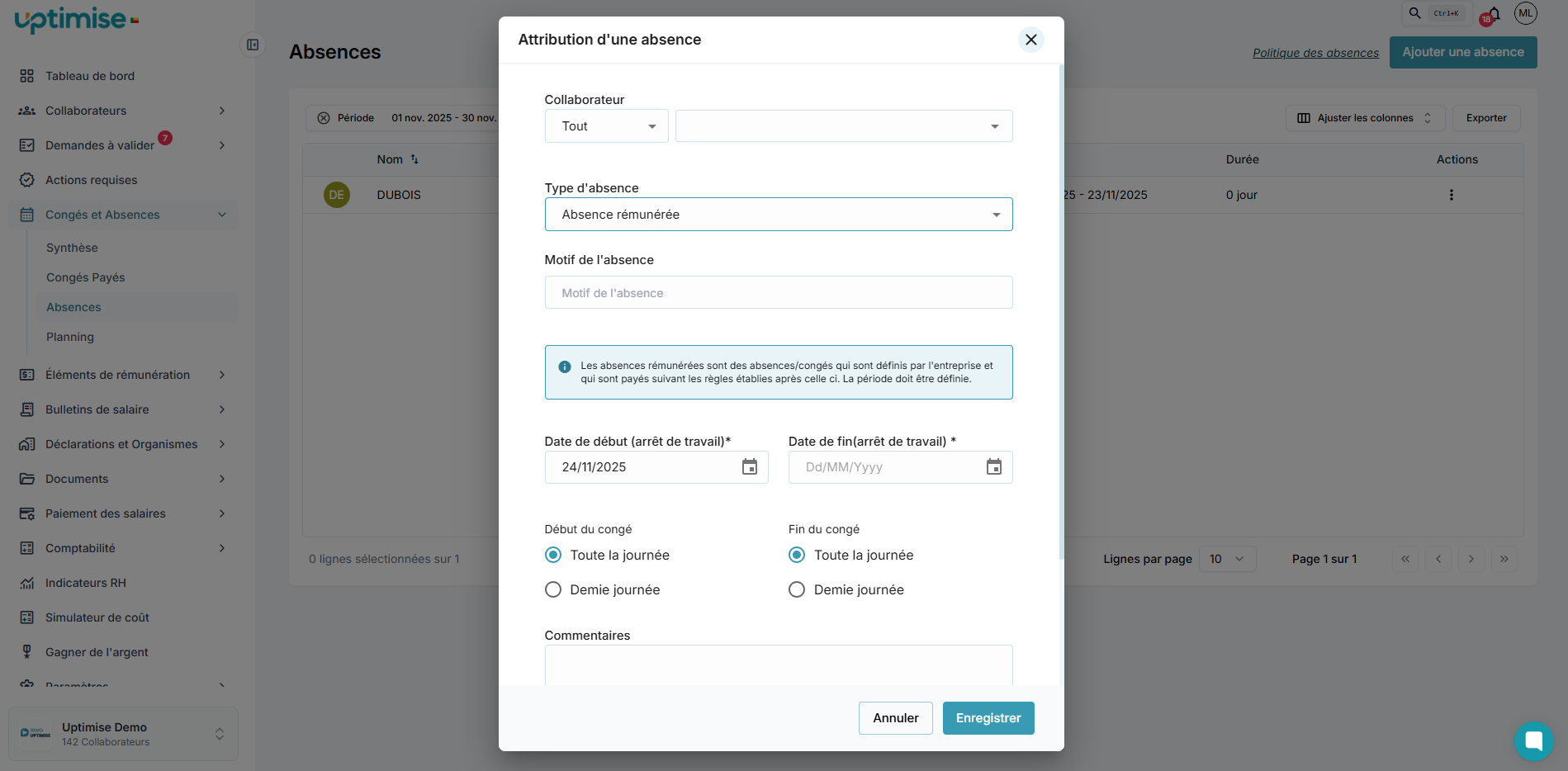 Cliquez ensuite sur le bouton "Ajouter une absence" et saisissez les détails de l'absence comme suit :