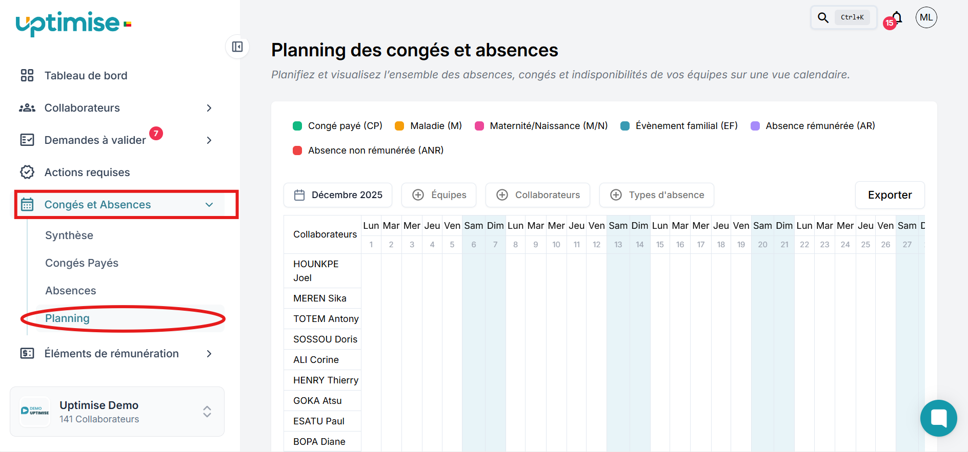 Sur Uptimise, vous pouvez voir le planning des congés par collaborateurs sur la période (par mois) et selon le type d’absences après leurs ajouts, présentés en légende ci-dessous (Congé payé, maladie, maternité ou naissance, événement familial, absence rémunérée ou non rémunérée) :