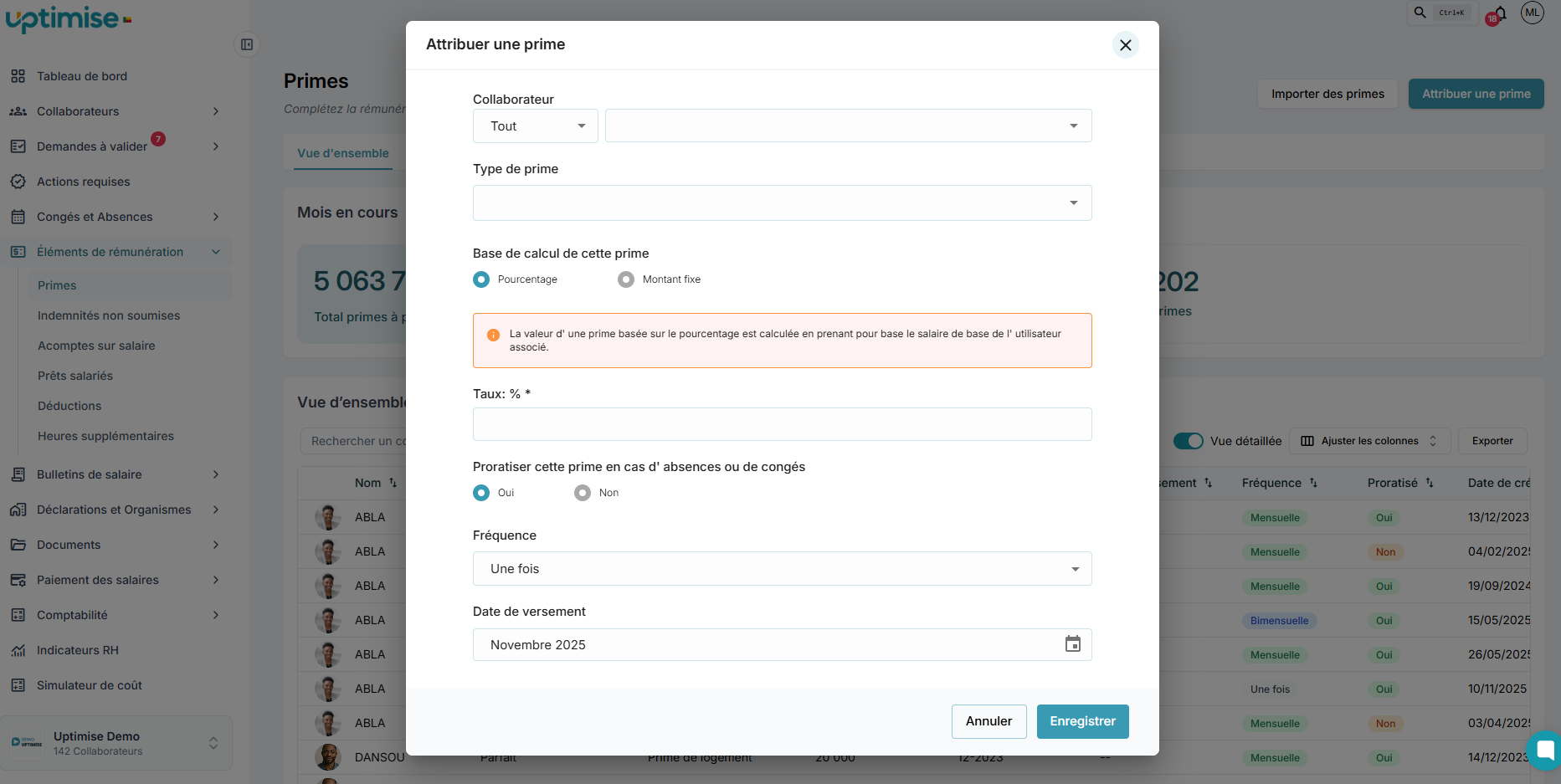 En suivant ces étapes, vous pouvez facilement gérer les primes des collaborateurs sur Uptimise. Pour toute assistance supplémentaire, n'hésitez pas à consulter notre support à contacter notre équipe d'assistance dédiée.