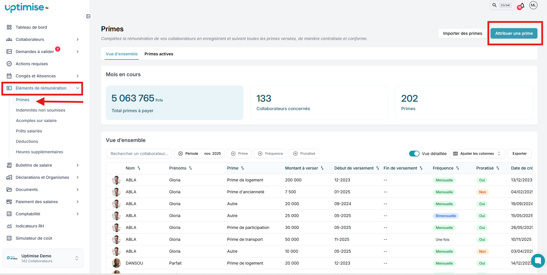 A partir du menu à gauche, Cliquez sur “Eléments de rémunérations”. Sélectionnez ensuite "Primes", puis cliquez sur "Attribuer une prime".