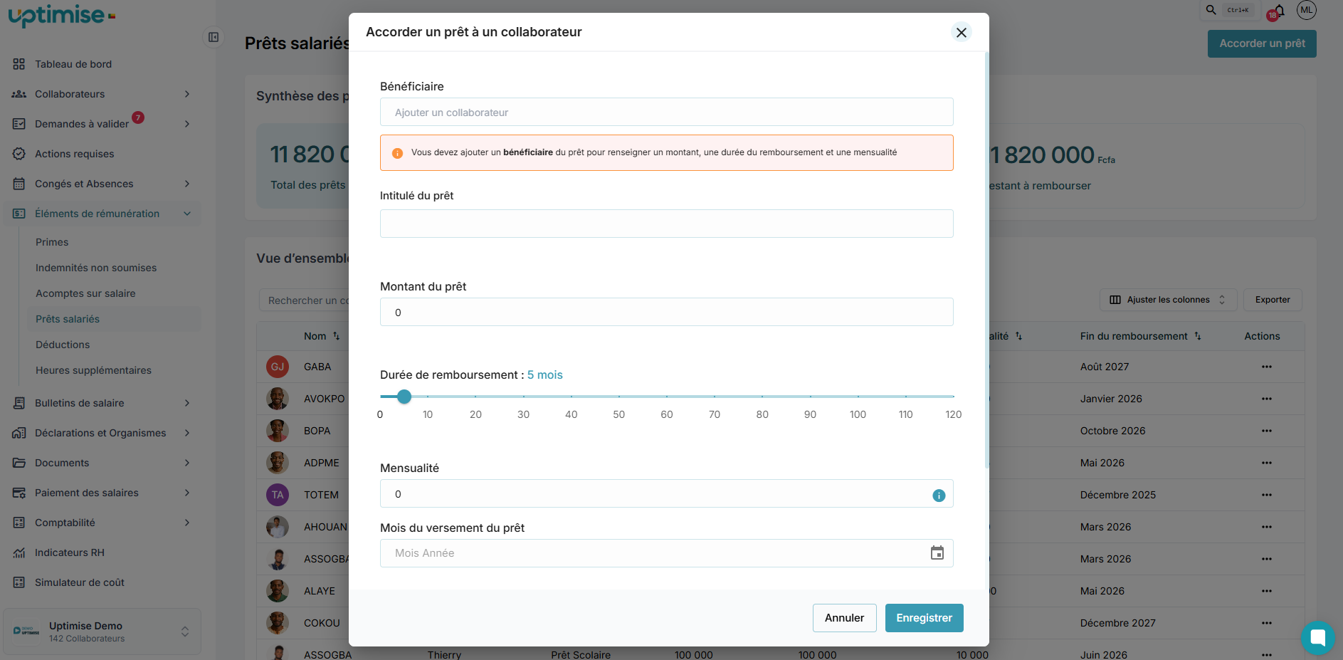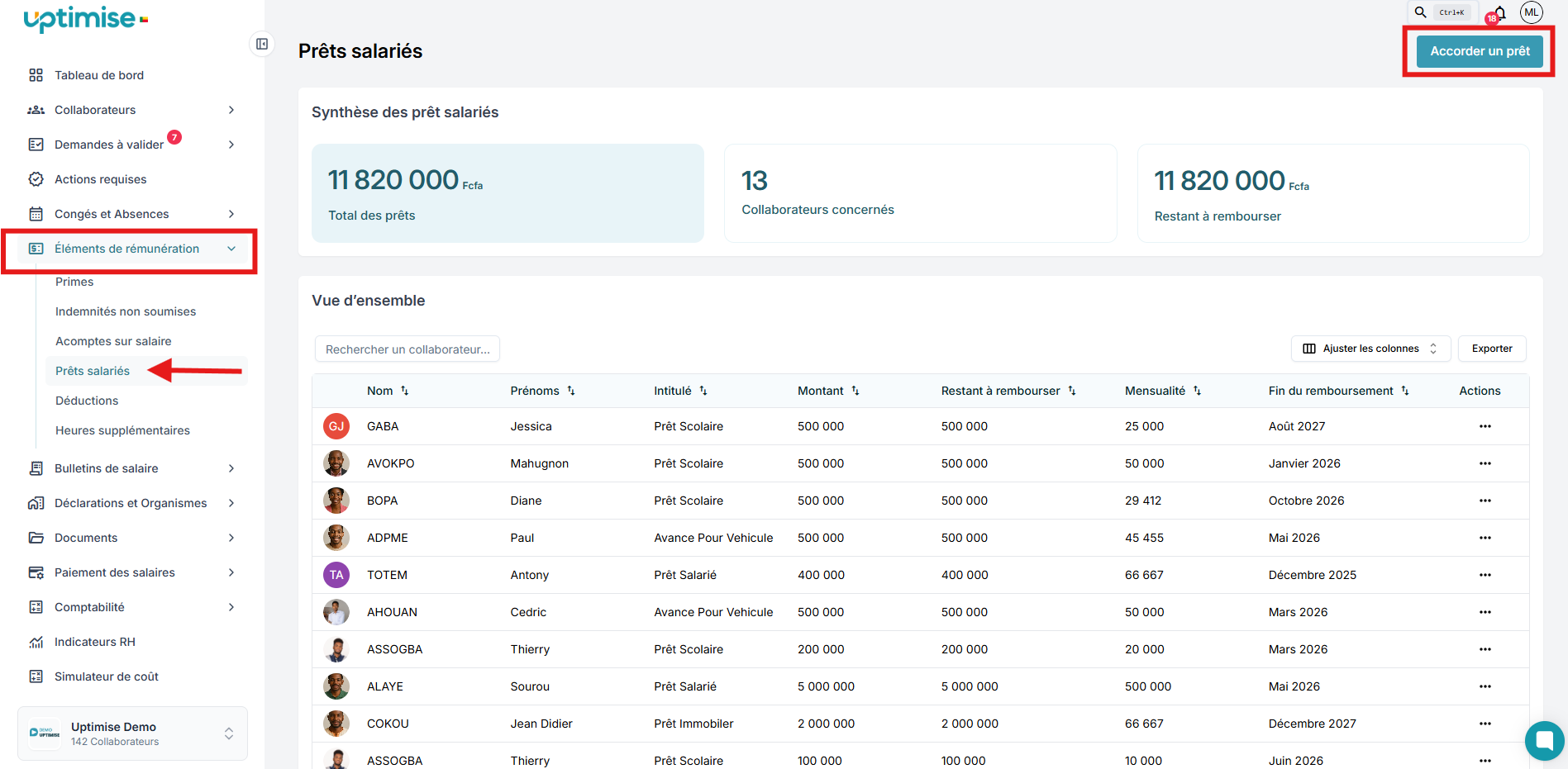 Pour gérer une avance sur salaire à partir de la plateforme Uptimise, il faut vous rendre dans la section >”Eléments de rémunération” ensuite la sous section > “Prêts salariés” et pour finir sur > “Accorder un prêt”.