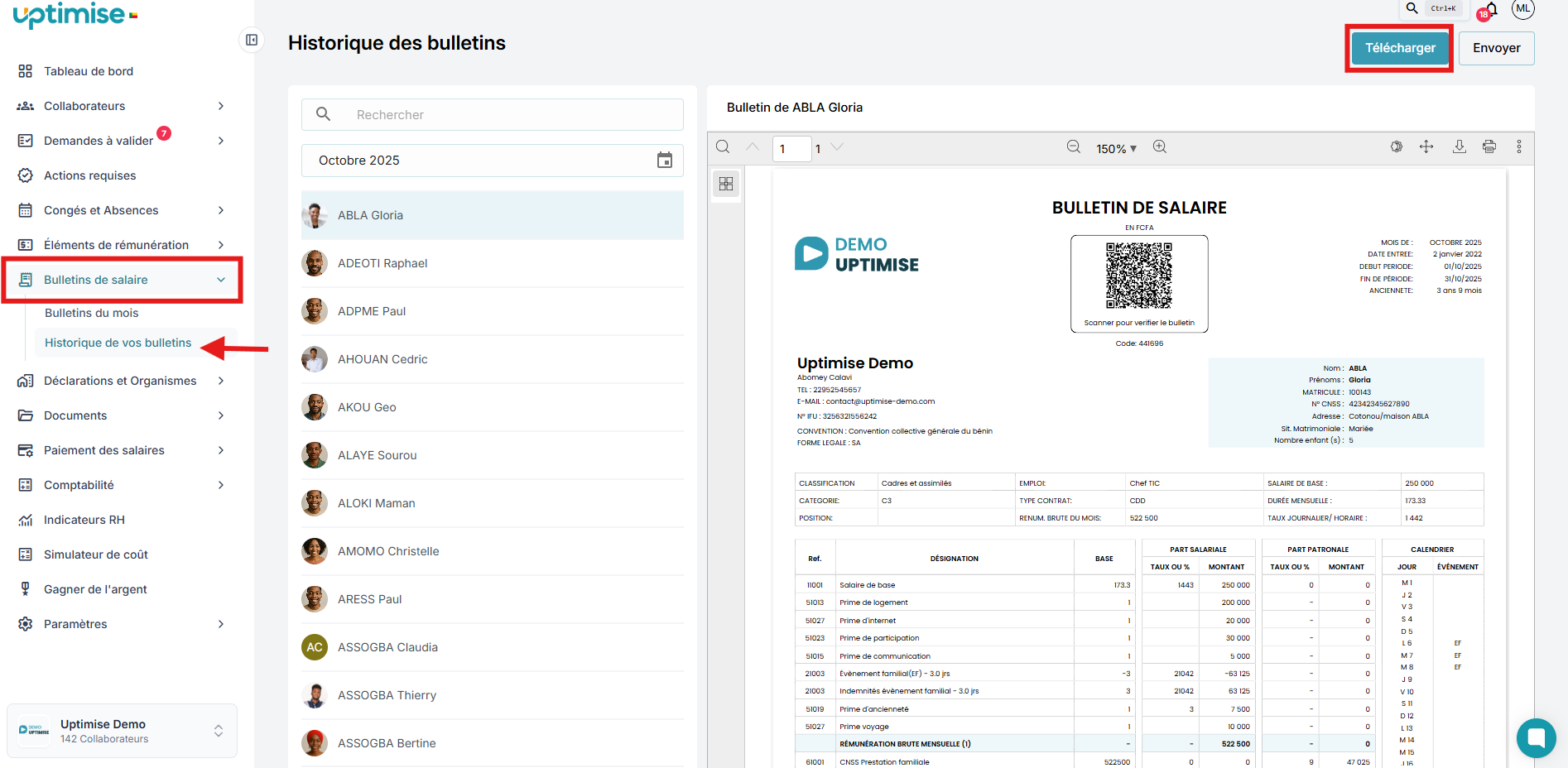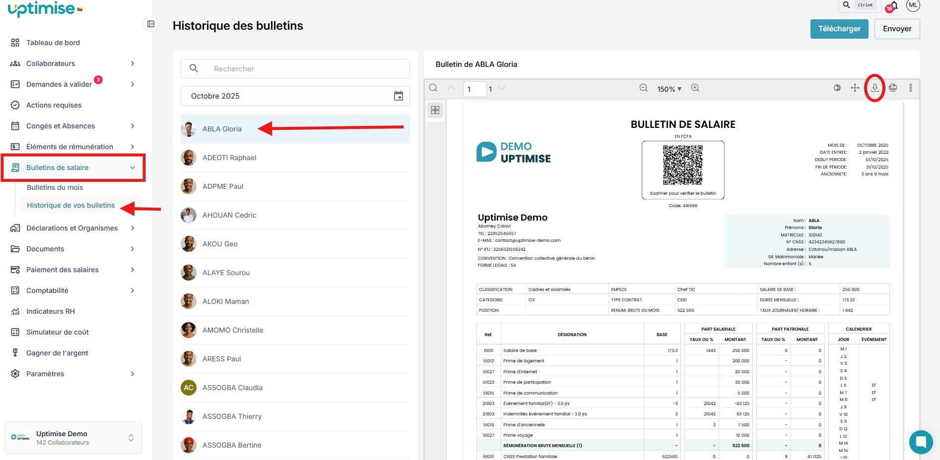 Vous pouvez également cliquez sur le nom de chaque collaborateur pour afficher son bulletin et le télécharger à l'aide de l'icone télécharger qui se trouve en haut à droite du bulletin.