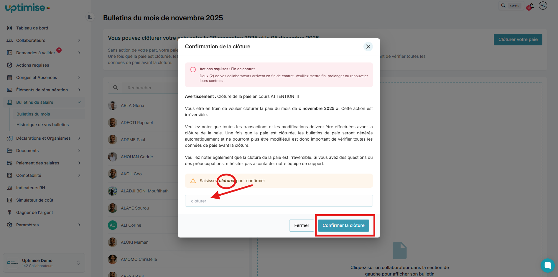 Une fois le bouton "Clôturer votre paie" sélectionnez, il vous suffira de saisir le mot cloturer>> tout en respectant la case et de cliquer sur "confirmer la clôture".