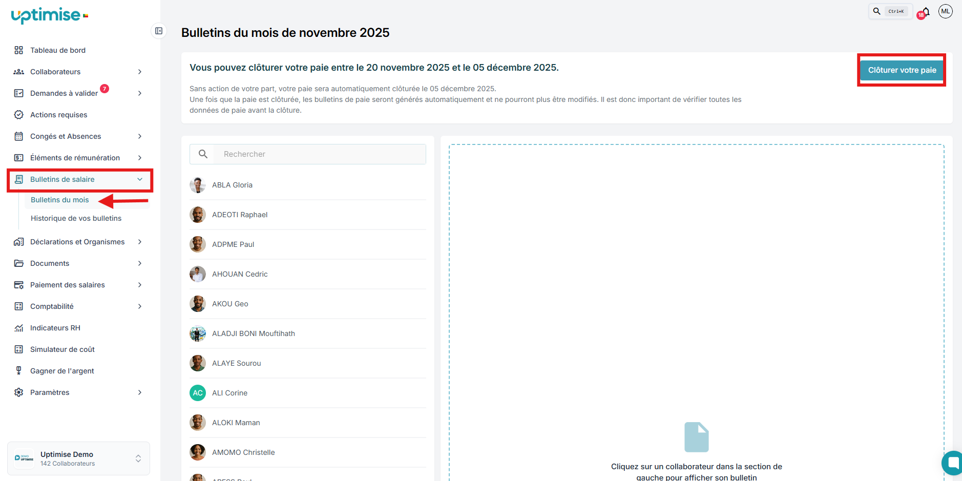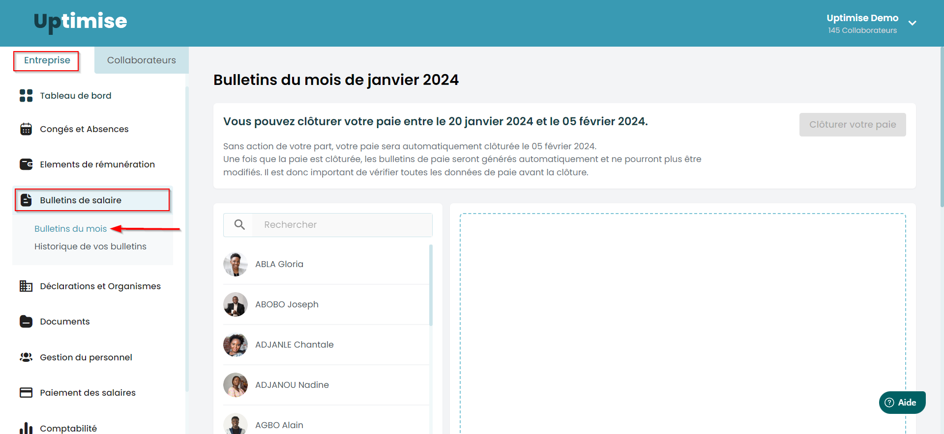Sur Uptimise.io la clôture de la paie se fait entre la date 20 du mois en cours et la date 5 du mois suivant.