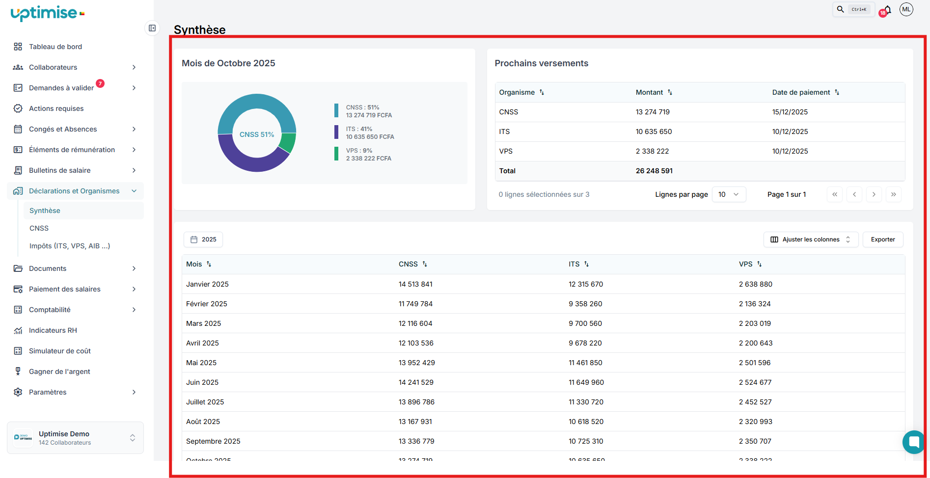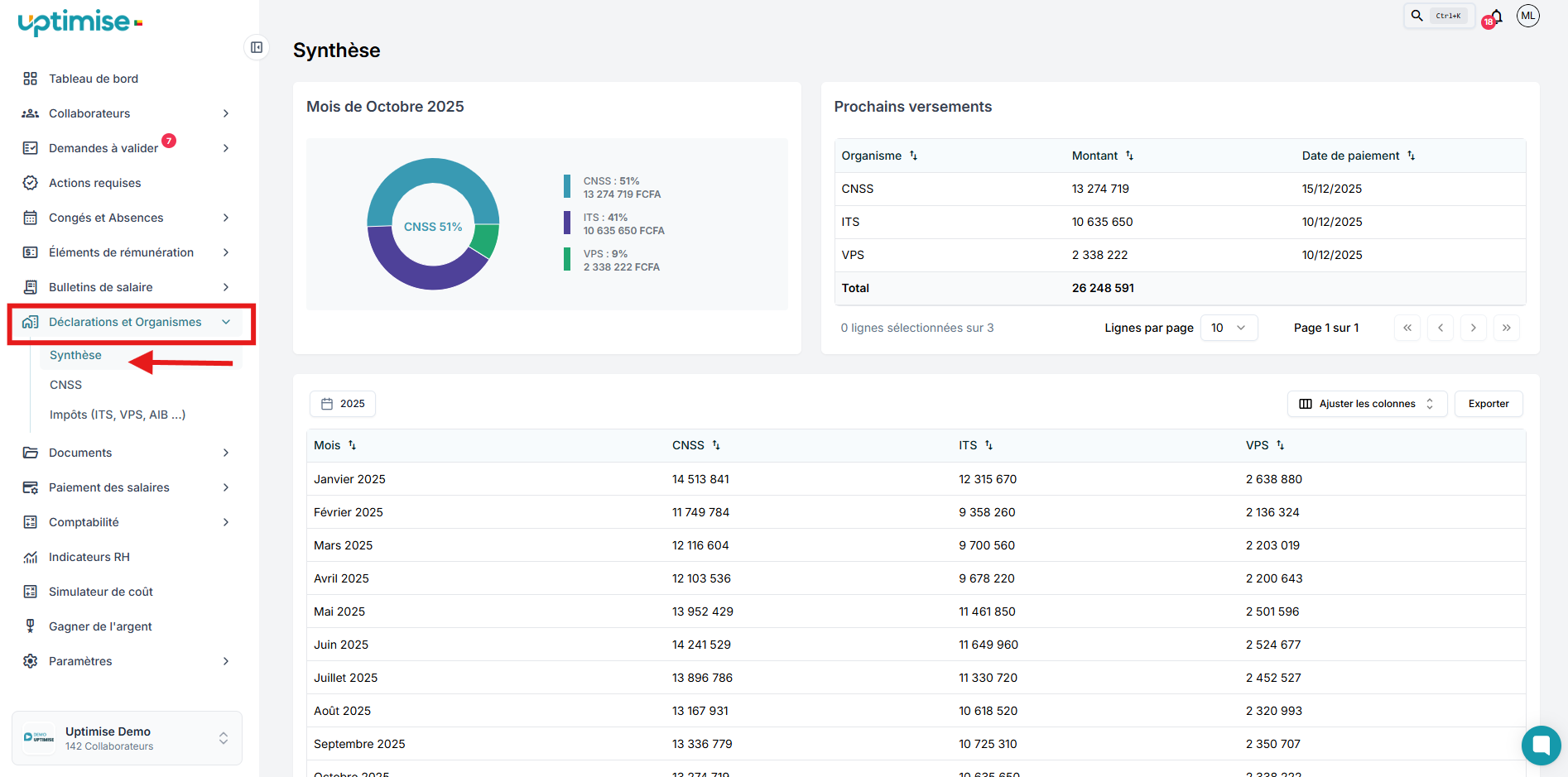 Ici, vous avez la synthèse des déclarations sociales et fiscales (CNSS, ITS et VPS) pour le mois en cours et les mois antérieurs. Il y’a également les rappels des prochains versements à effectuer dans ces différents organismes. Ainsi donc, vous serez à jour et en total conformité dans vos déclarations.