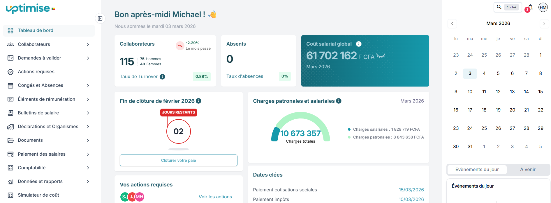 La plateforme Uptimise est facile à utiliser et permet aux entreprises de gérer facilement les salaires, les congés et absences, les primes et avantages, les avances sur salaire, les notes de frais et les bulletins de salaires. En outre, Uptimise permet une meilleure gestion des informations et des documents relatifs aux employés, tels que les contrats de travail, et les fiches de paie. La plateforme est disponible en ligne, accessible à tout moment et depuis n'importe quel appareil avec une connexion Internet.