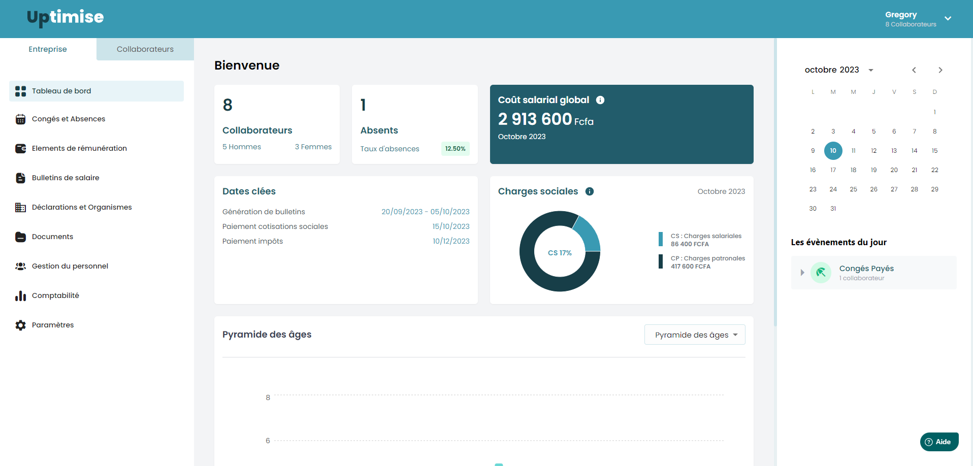 La plateforme Uptimise est facile à utiliser et permet aux entreprises de gérer facilement les salaires, les congés et absences, les primes et avantages, les avances sur salaire, les notes de frais et les bulletins de salaires. En outre, Uptimise permet une meilleure gestion des informations et des documents relatifs aux employés, tels que les contrats de travail, et les fiches de paie. La plateforme est disponible en ligne, accessible à tout moment et depuis n'importe quel appareil avec une connexion Internet.
