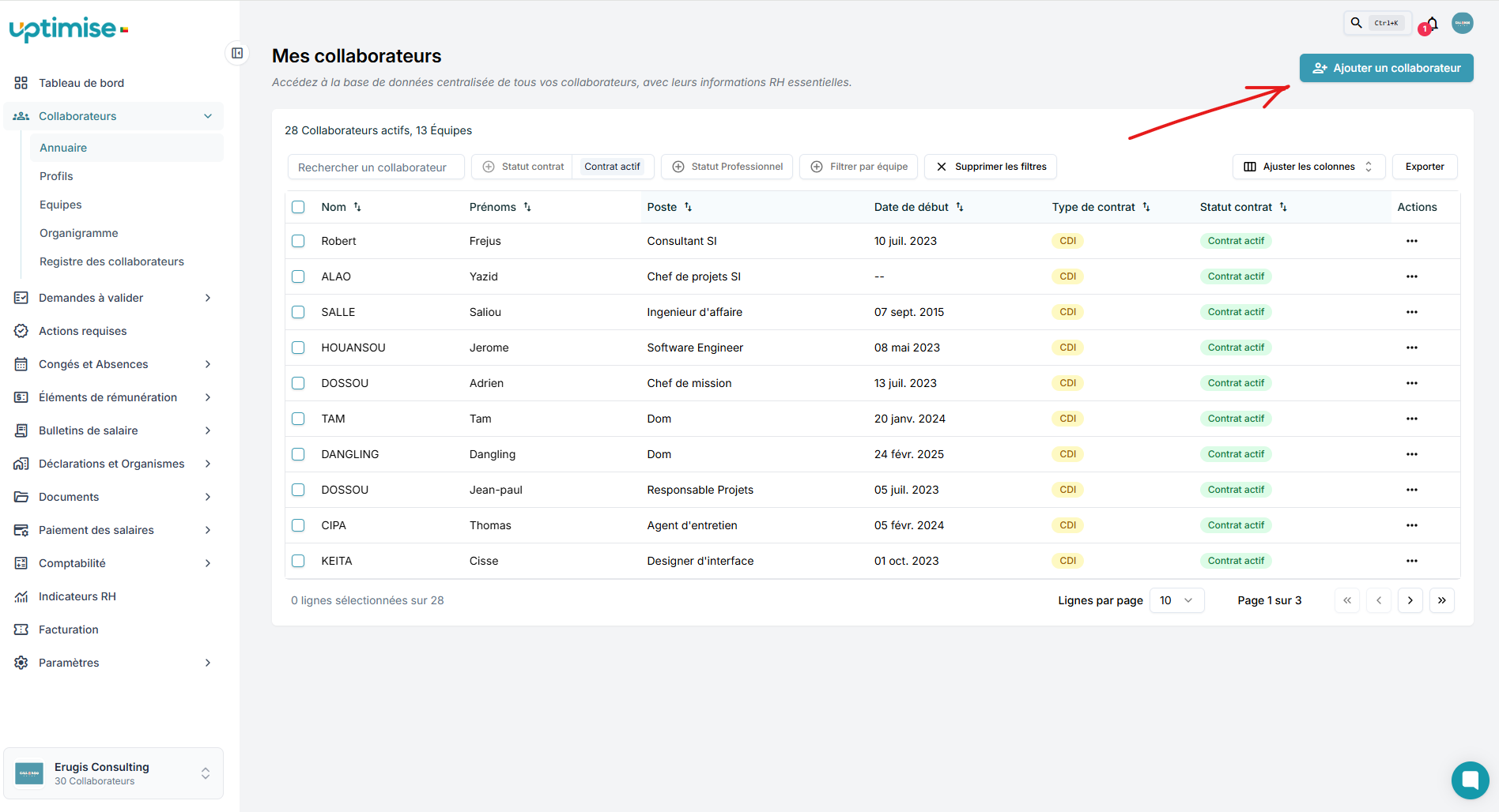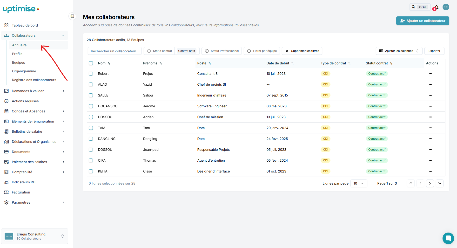 Étape 1 – Accéder à l’annuaireDepuis votre tableau de bord, cliquez sur le menu Collaborateurs dans la barre latérale à gauche, puis choisissez Annuaire.