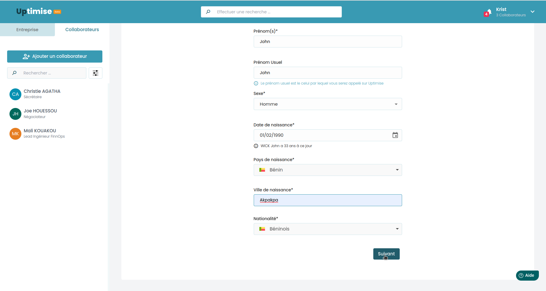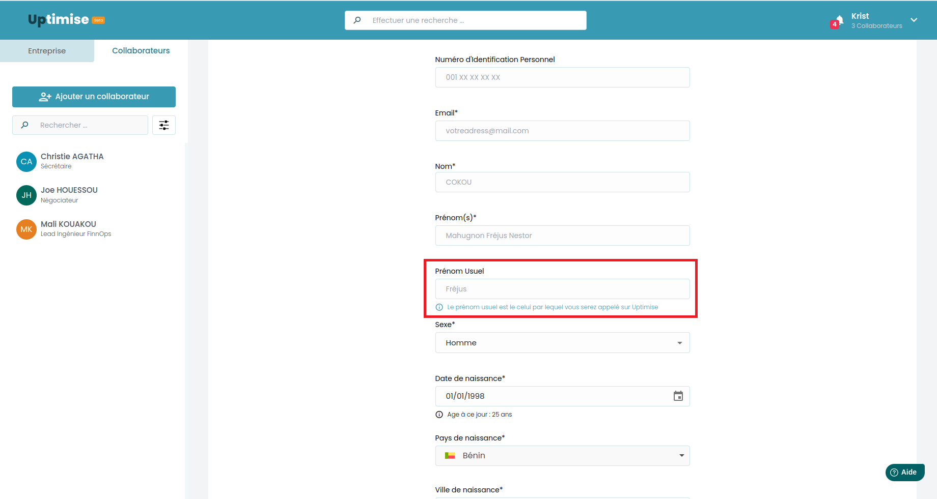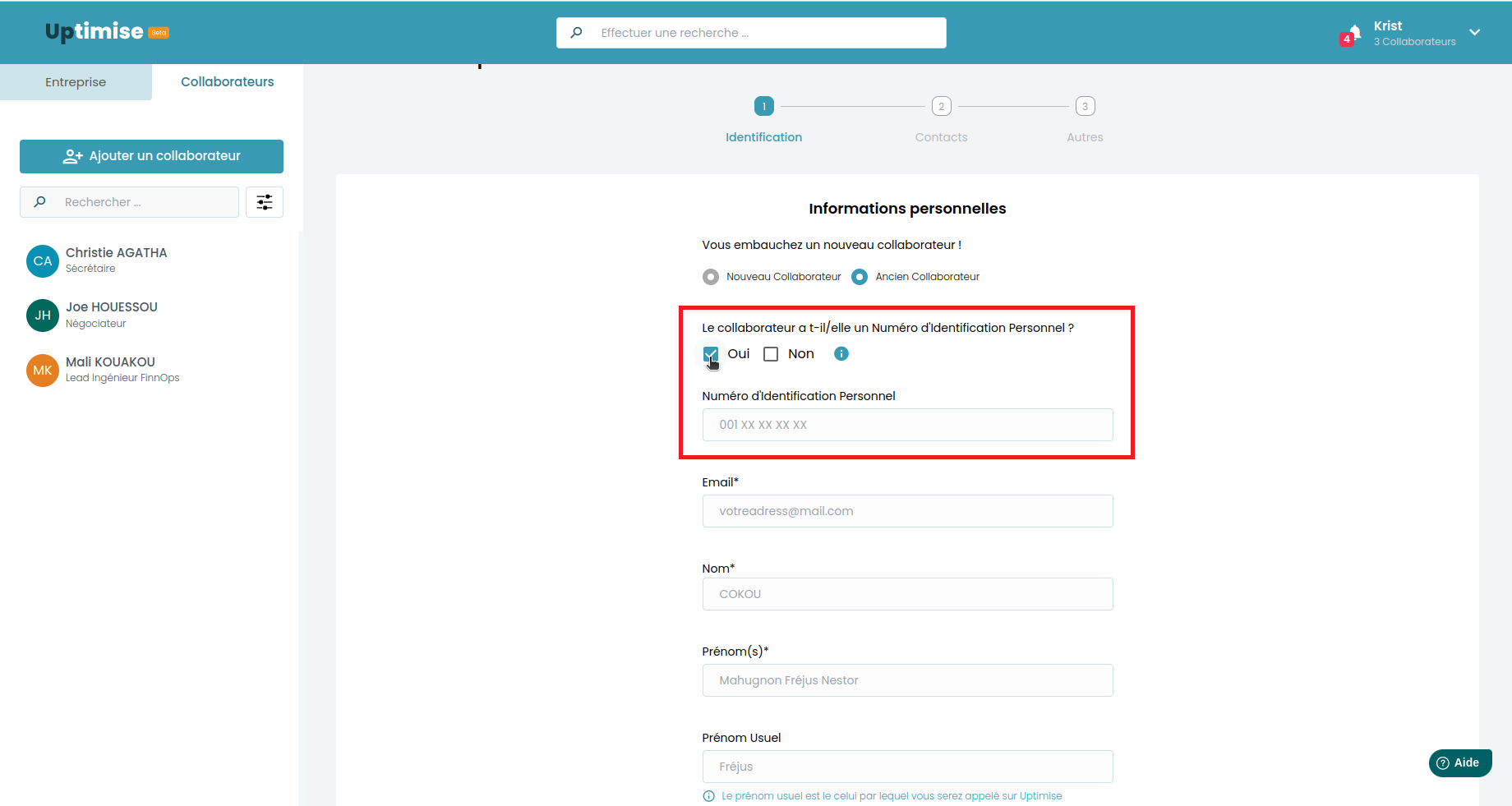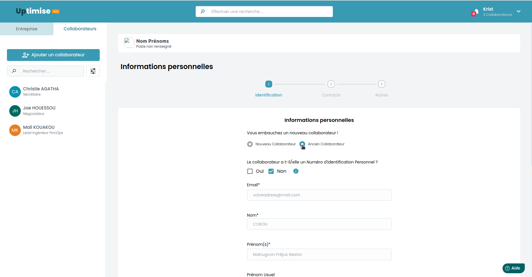 a. Si c'est un nouveau collaborateur, la case est déjà cochée par défaut. Il suffit juste de remplir le reste des informations du collaborateur: