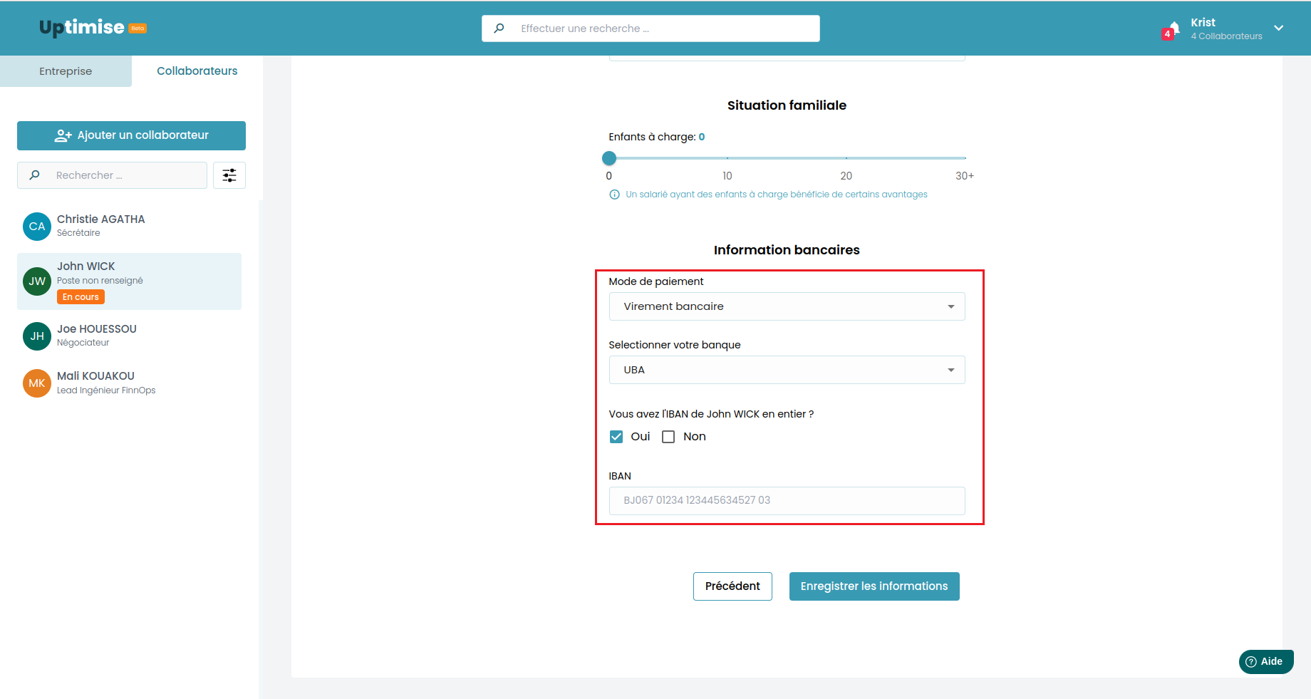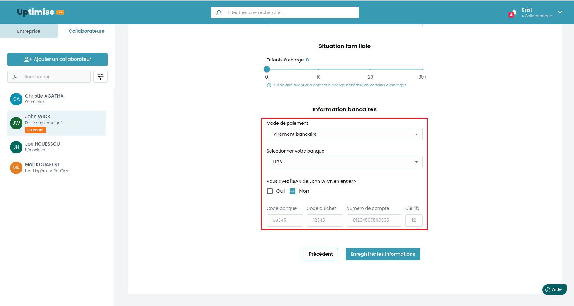 Informations bancaires: Au sein de cette section, il vous incombe de déterminer le mode de règlement, de sélectionner l'établissement bancaire approprié et, enfin, de renseigner l'IBAN du collaborateur.