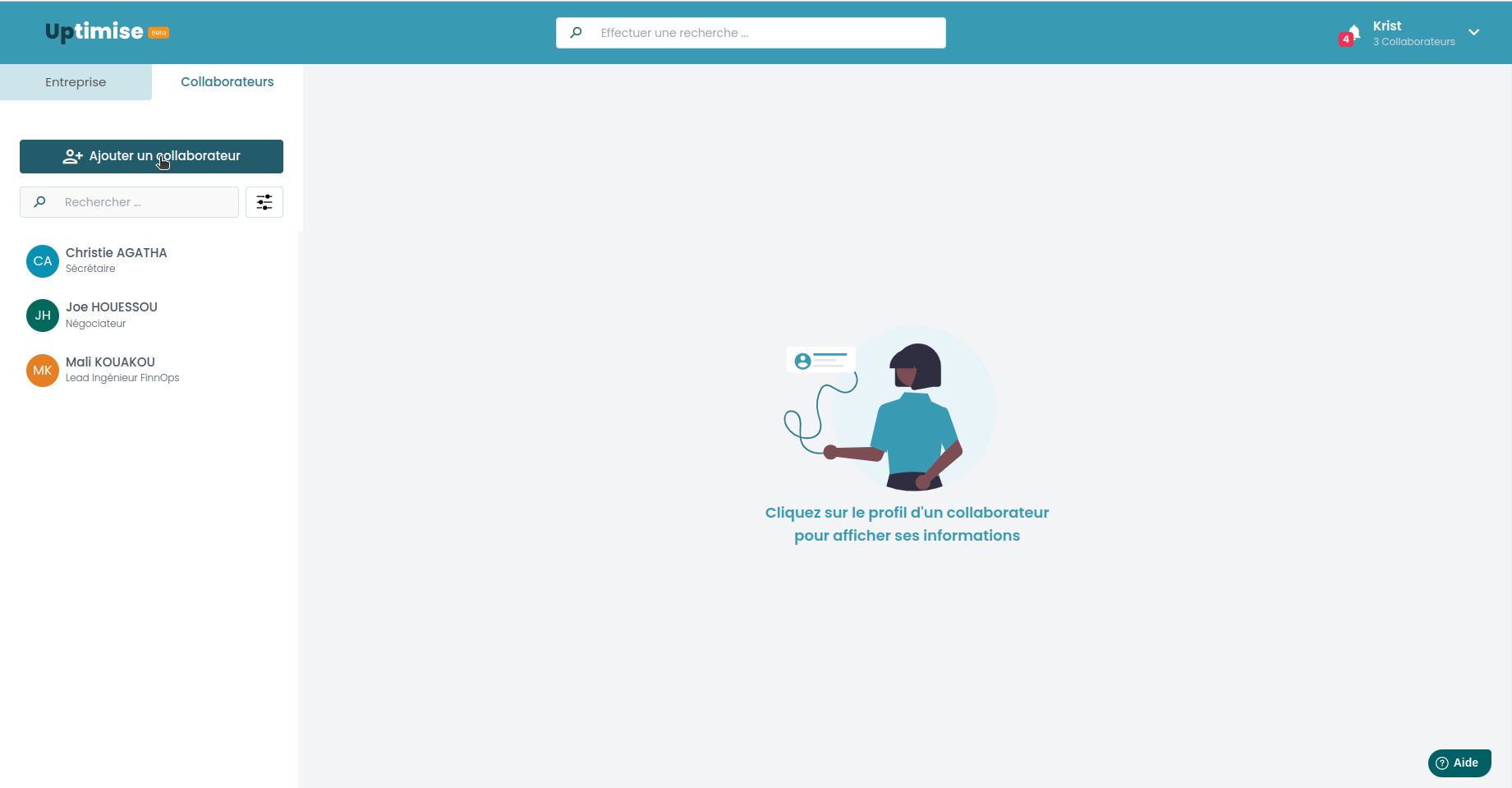 Étape 2 – Démarrer l’ajoutEn haut à droite de la liste des collaborateurs, cliquez sur le bouton bleu + Ajouter un collaborateur.