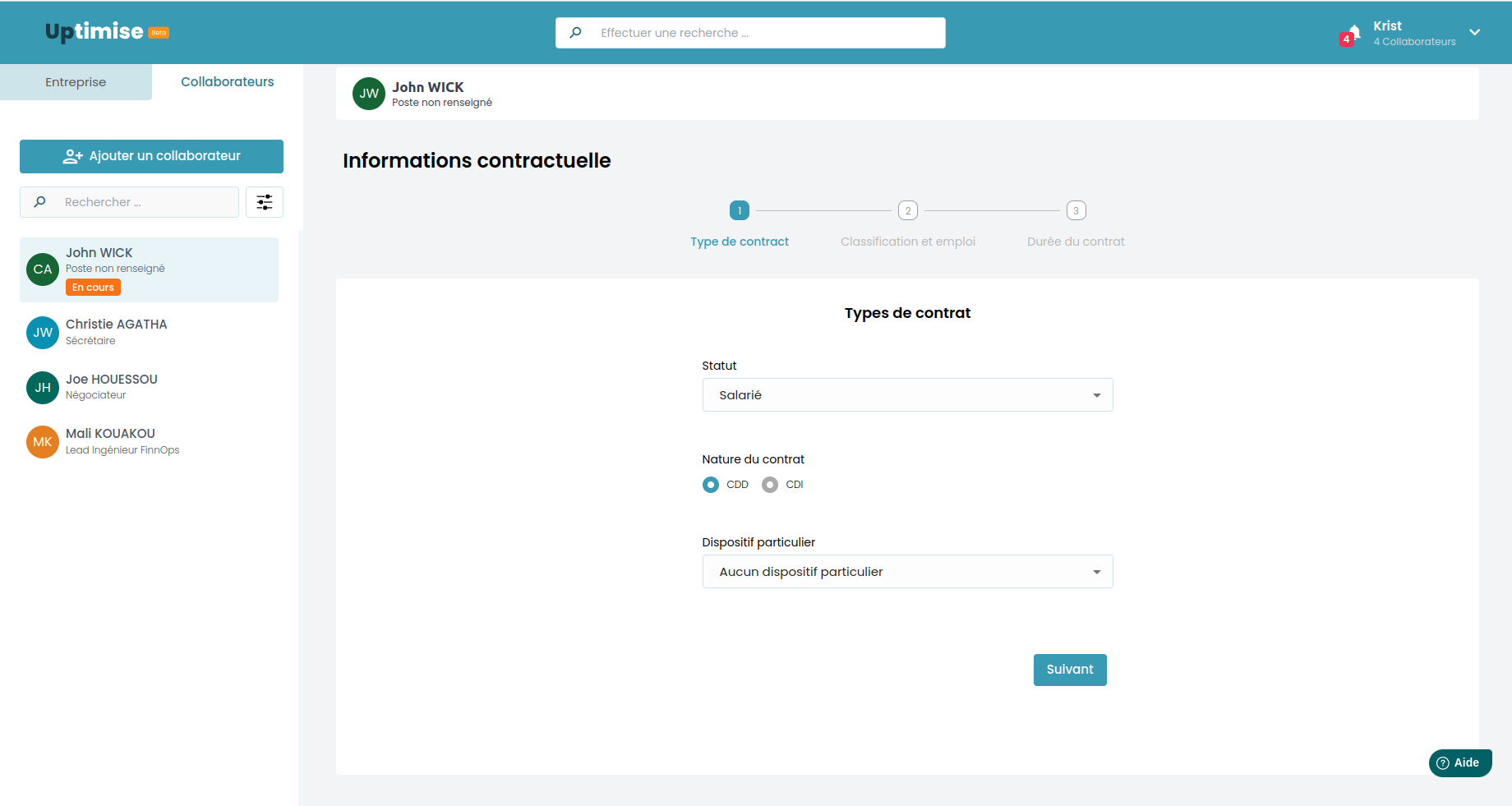 - Définir le statut du collaborateur (Salarié, Apprenti, Stagiaire/Alternant, Prestataire/Indépendant) ;