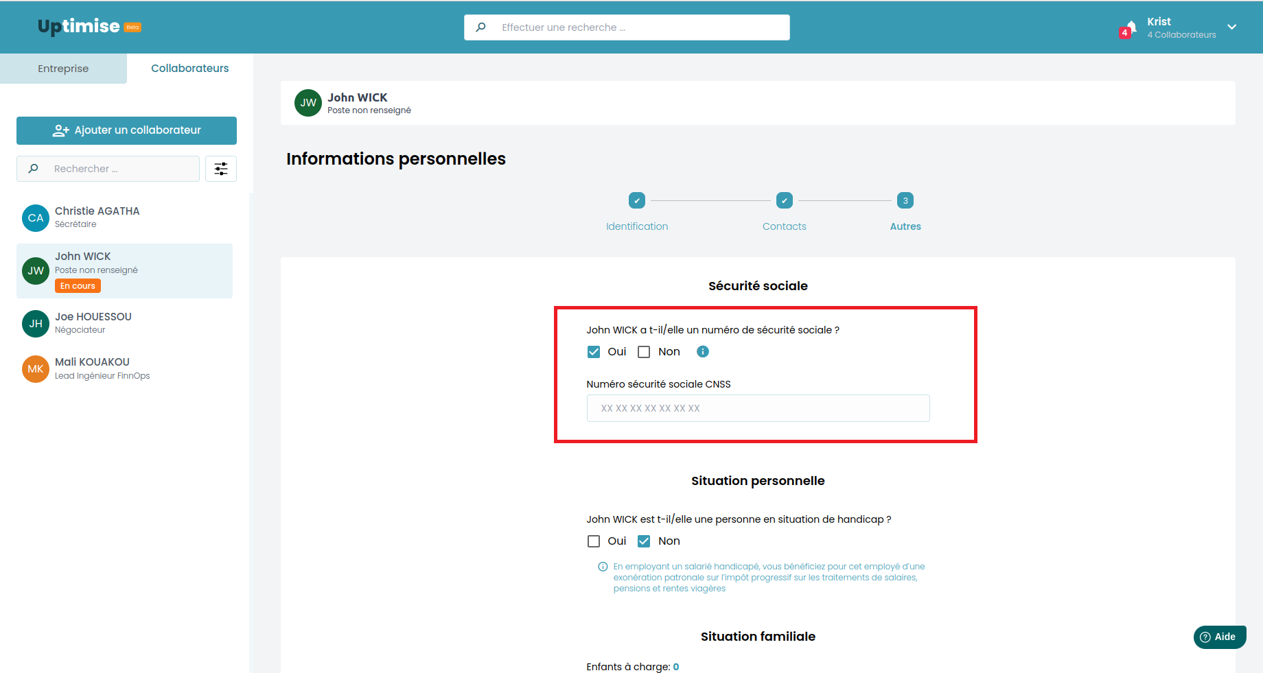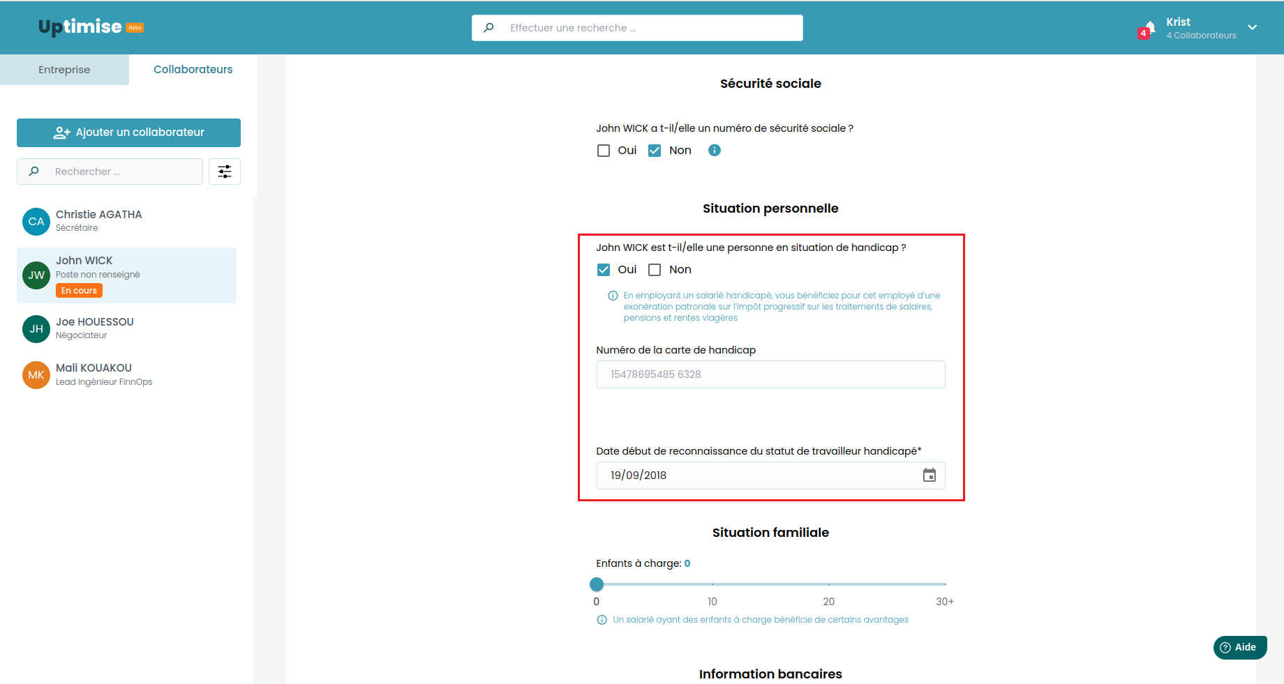 Situation Personnelle: Si votre collaborateur est en situation de handicap, cochez "Oui" puis remplissez les informations ( Numéro de la carte de handicap et la date de reconnaissance du statut de travailleur handicapé ).