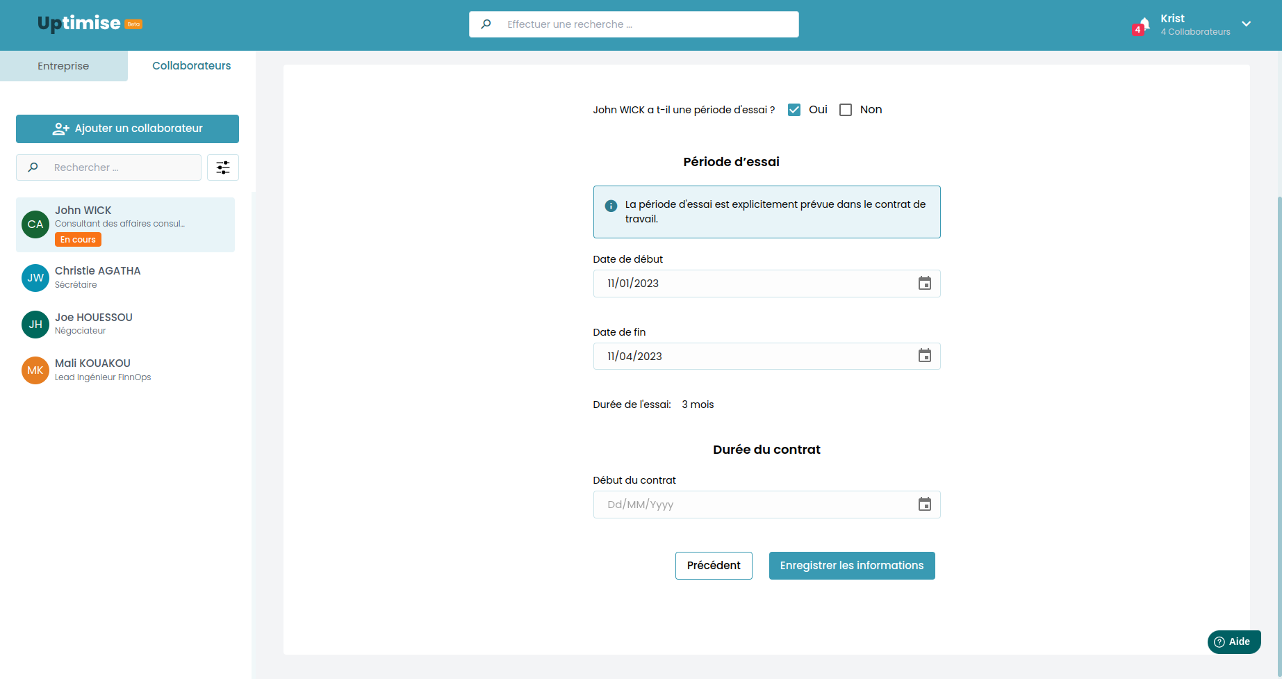 Dans le cas où le collaborateur doit faire une période d'essai d'abord, vous devez cocher la case "OUI" afin d'enregistrer la date de début et de fin de la période d'essai.