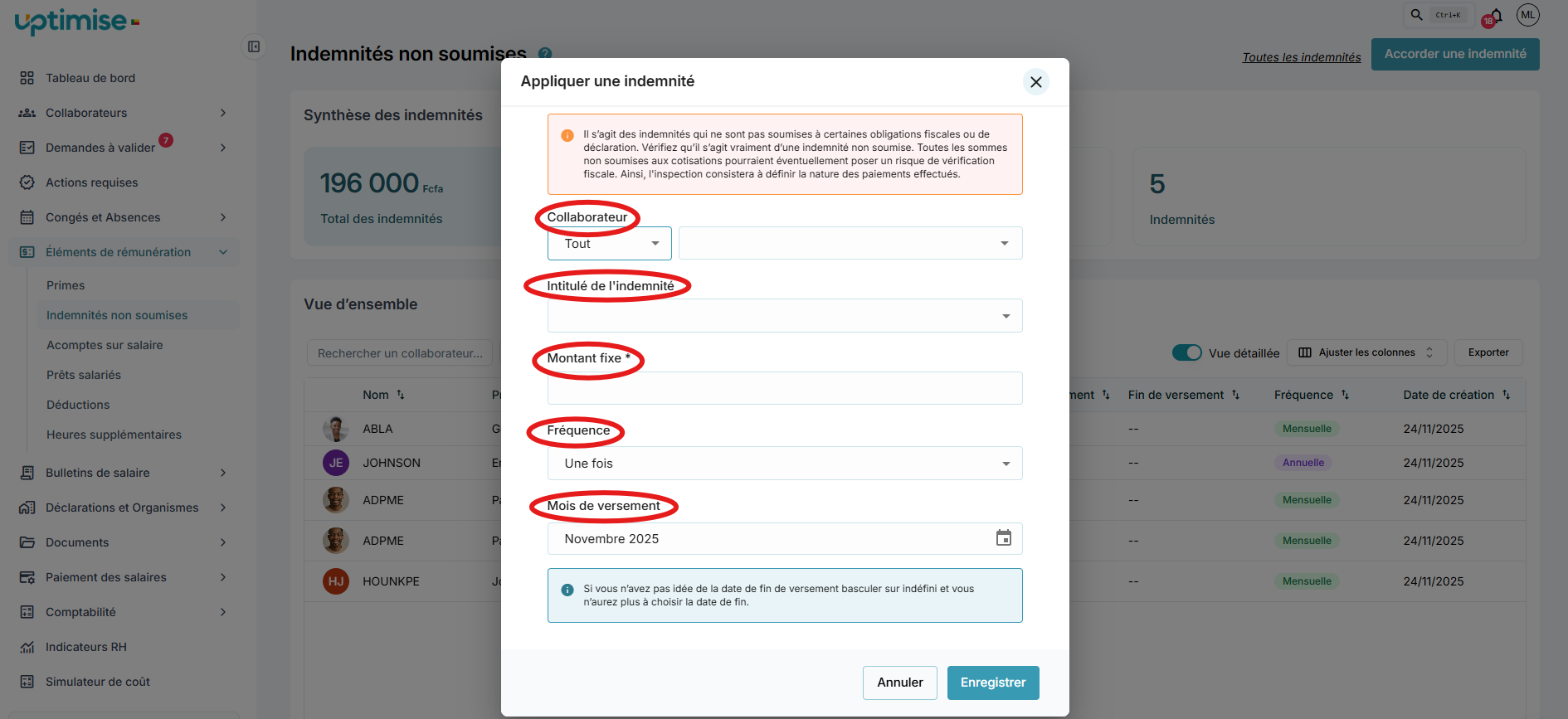 - Mois de Versement : Sélectionnez le mois où l'indemnité doit être versée.