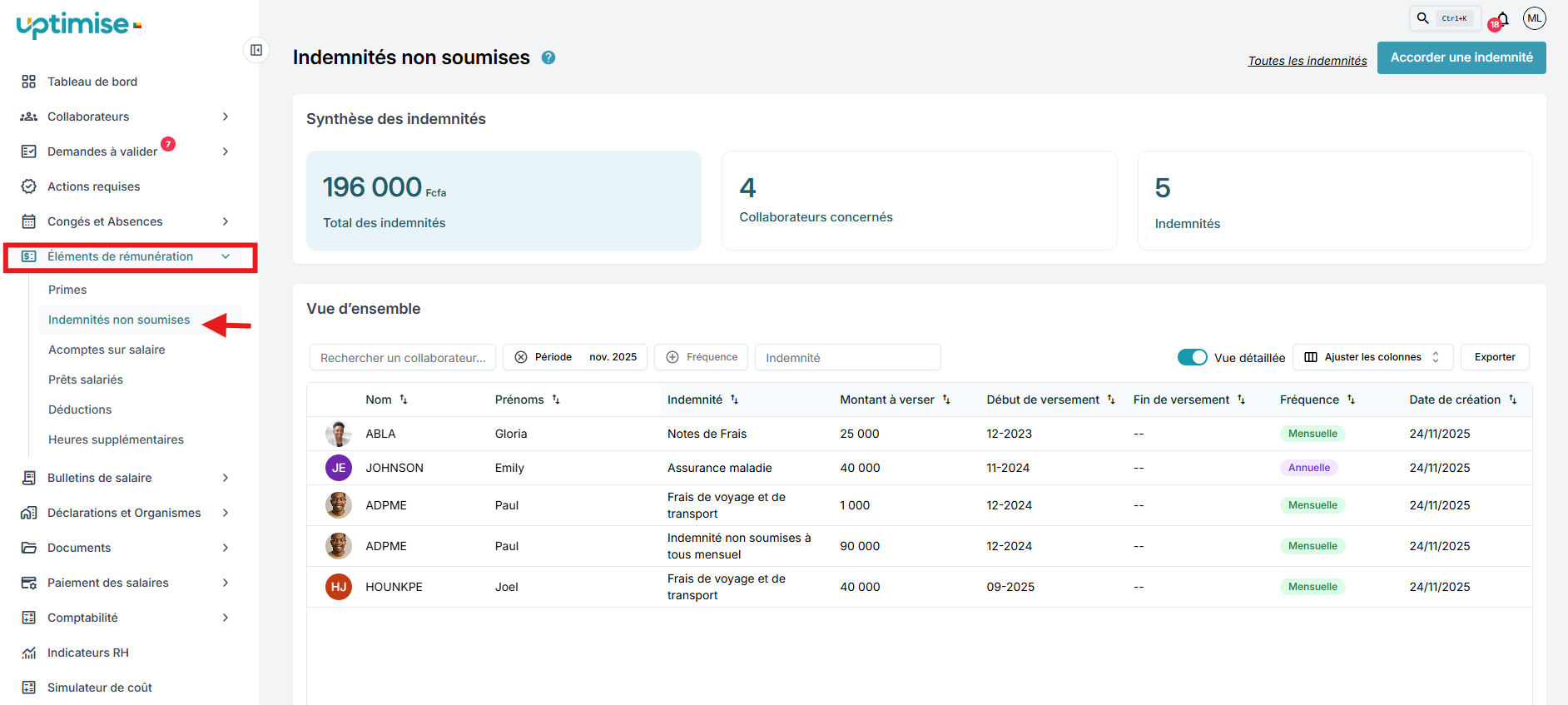 - Cliquez sur l'onglet "Indemnités non soumises" pour gérer ce type de compensation.