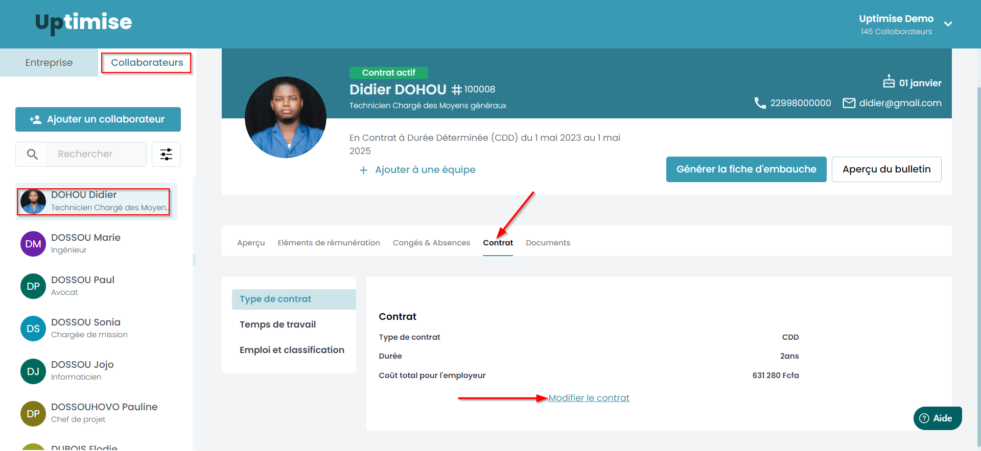 Lorsque les informations du contrat d'un collaborateur changent, il vous faut effectuer une mise à jour de son contrat et cela est possible sur la plateforme Uptimise.