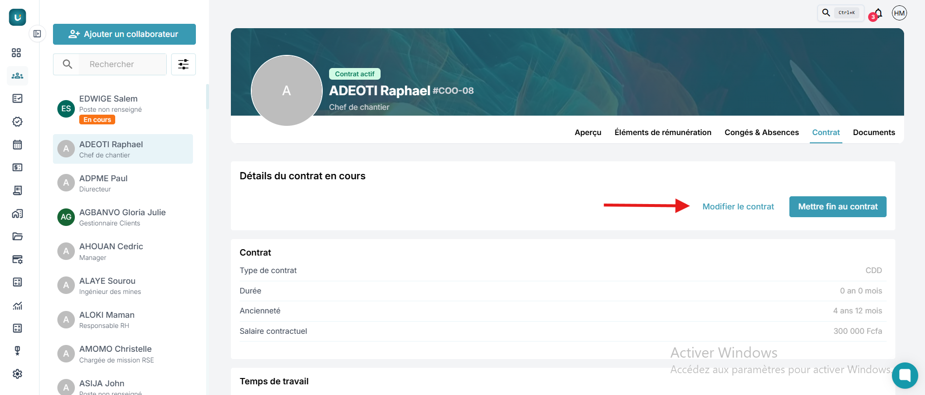 Sélectionnez et cliquez sur le nom du collaborateur dont il est question ensuite sur "Contrat" et enfin sur "Modifier le contrat".
