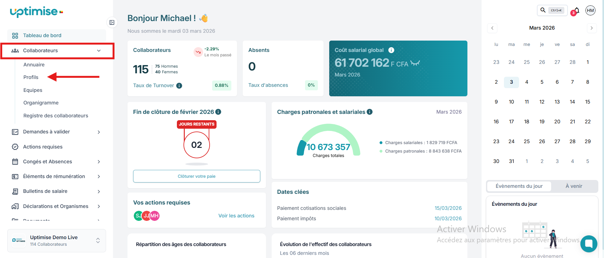 Pour faire une mise à jour du contrat, rendez vous sur le menu à gauche, cliquez sur "Collaborateurs" puis aller sur “Profil”.