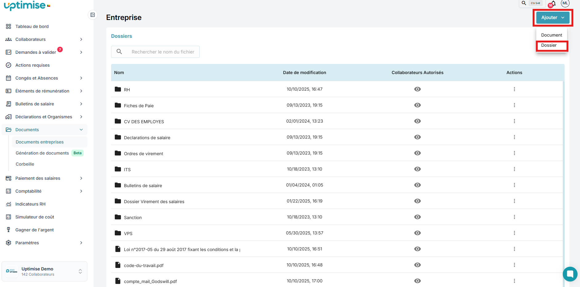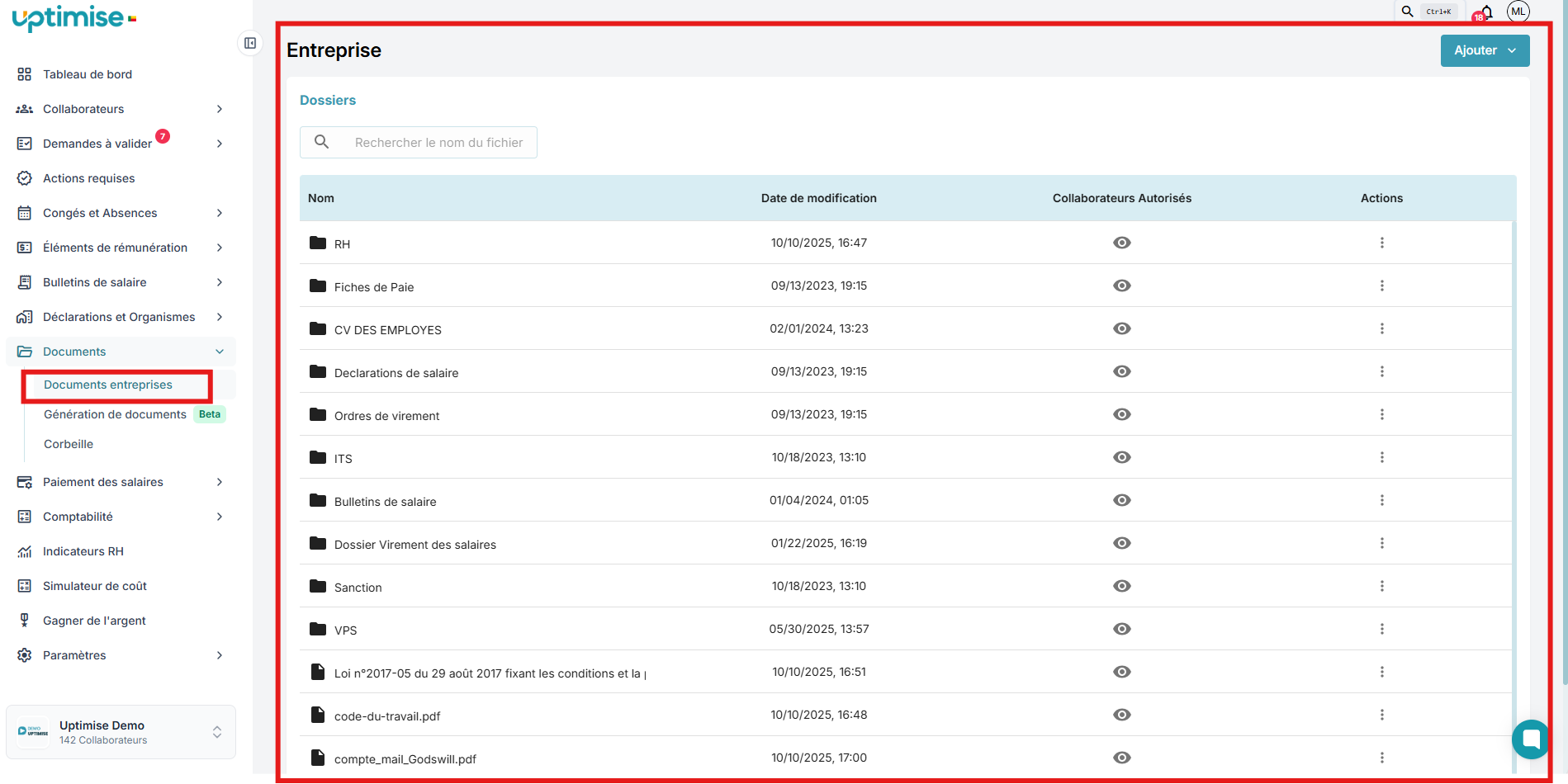 1. Accéder à "Documents entreprise" : Cliquez sur le sous-menu "Documents entreprise" pour ouvrir la page dédiée à la gestion des documents.