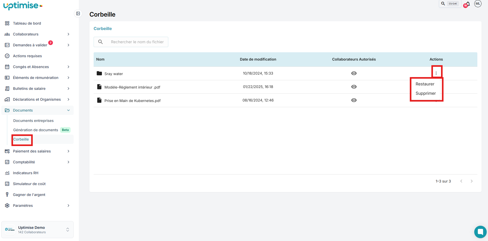 - Restaurer un document : Cliquez sur le bouton d'action à côté du document ou dossier souhaité et sélectionnez "Restaurer" pour le remettre en place.