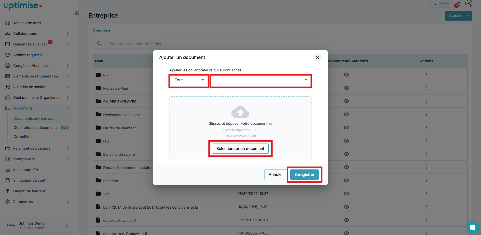 - Sélectionner les collaborateurs autorisés : Utilisez le menu déroulant pour choisir à qui le document sera accessible (par exemple, salarié, prestataire, stagiaire, etc.).