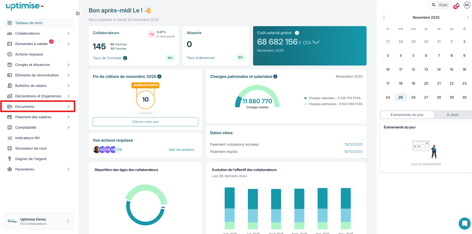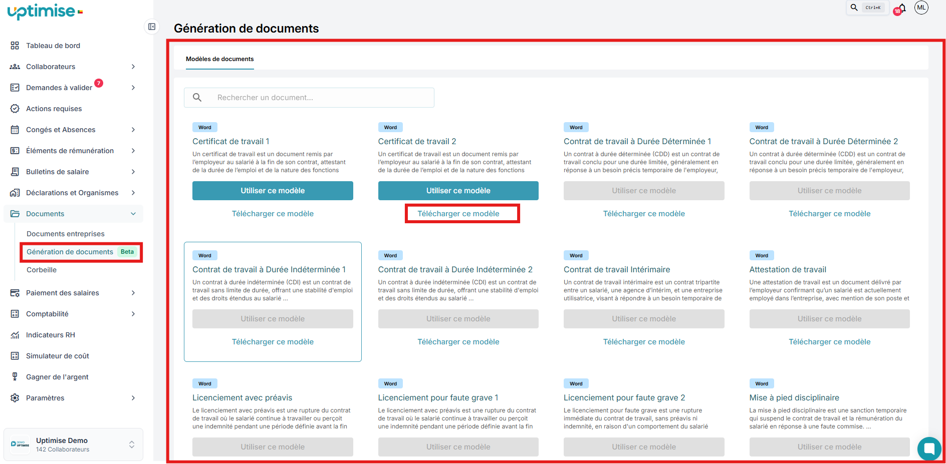 Accéder à “Génération de document” : Dans le sous-menu “Documents”, cliquez sur “Génération de documents” pour voir les différents documents liés à l’administration et à la gestion RH