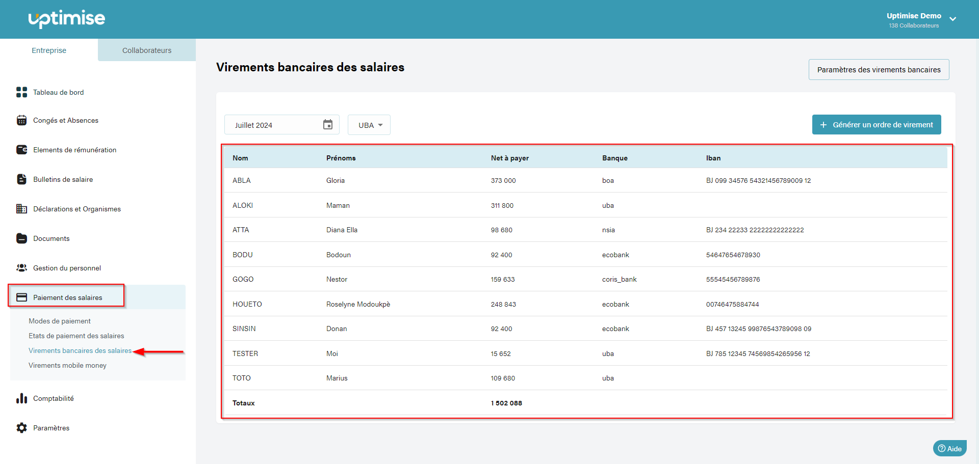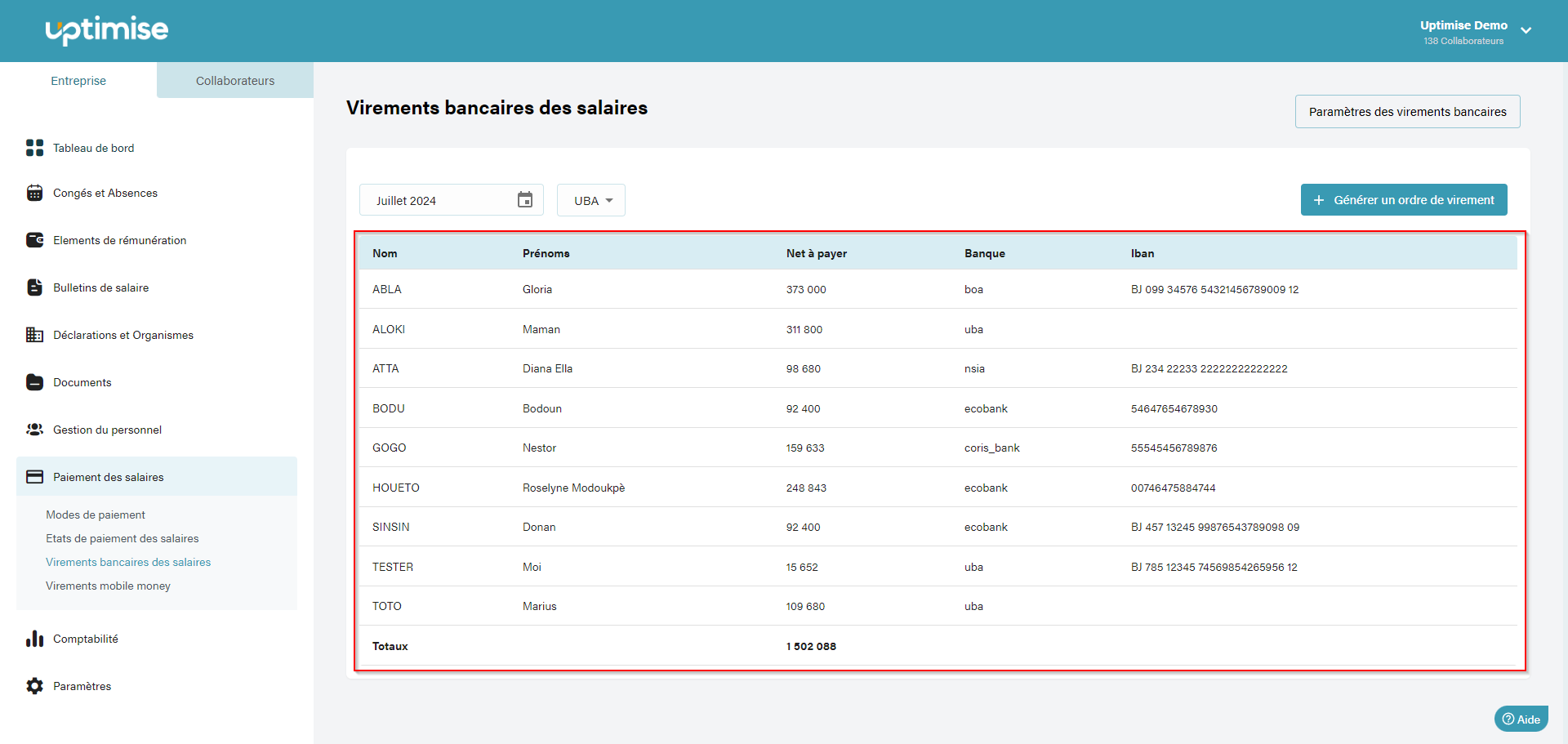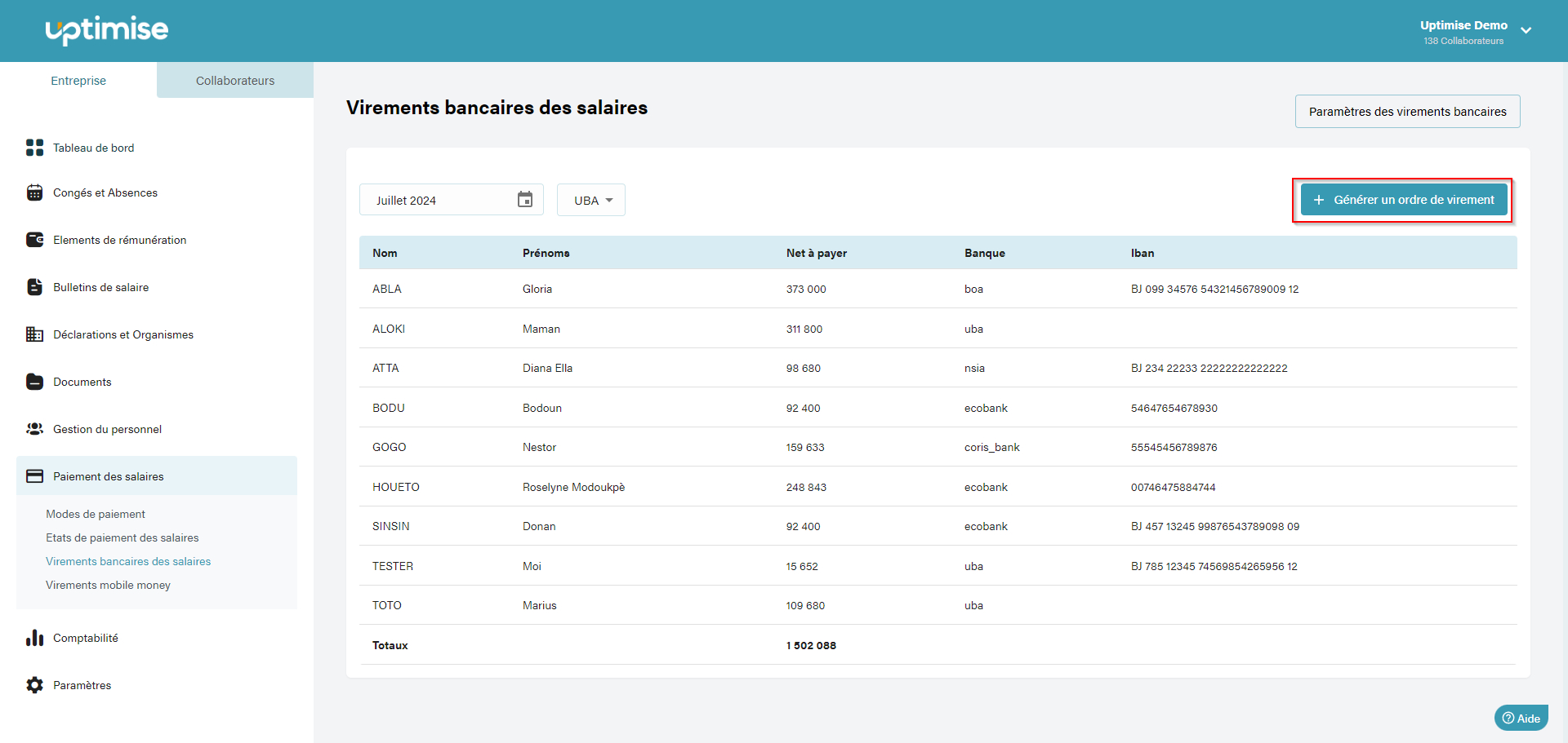 En suivant ces étapes, vous pouvez facilement générer un ordre de virement sur la plateforme Uptimise, assurant ainsi une gestion fluide et rapide des paiements de vos collaborateurs. N'oubliez pas de bien paramétrer vos banques et signataires lors de la première utilisation afin de garantir que toutes les informations nécessaires soient en place pour des virements sans erreur. Si vous rencontrez des difficultés, le service d'assistance Uptimise est à votre disposition pour vous accompagner.